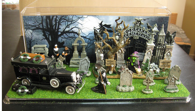 The accessories of this diorama are made by LEMAX, the figurines are mostly by HOMMIES and the Cadillac hearse was made by SOLIDO